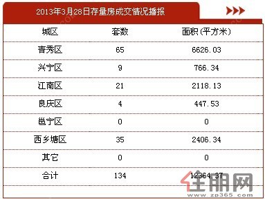此外,3月28日南宁存量房交易134套,面积12364.37㎡。其中,青秀区占65套,兴宁区占9套,江南区占21套,良庆区占4套,西乡塘区占35套。