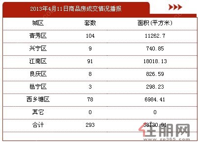 据南宁市房管局网站数据显示,4月11日南宁商品房签约293套,面积38130.91㎡。与前一日相比,成交套数下降了85套。从各城区成交分布来看,其中青秀区占104套,兴宁区占9套,江南区占91套,良庆区占8套,邕宁区占3套,西乡塘区占78套。
