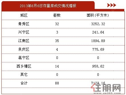 此外,6月5日南宁存量房交易88套,面积7123.16㎡。其中,青秀区占32套,兴宁区占3套,江南区占35套,良庆区占4套,西乡塘区占14套。